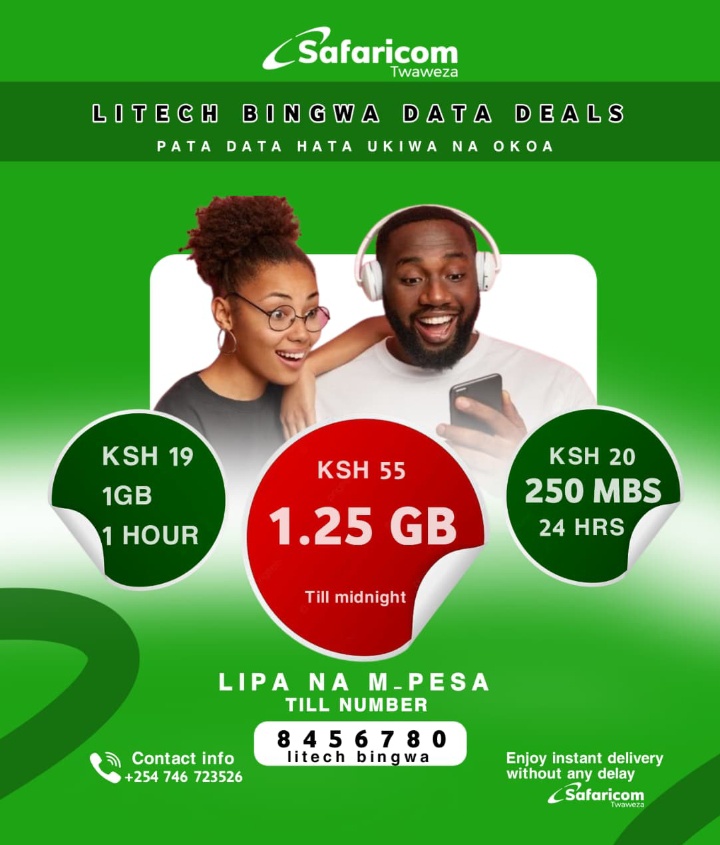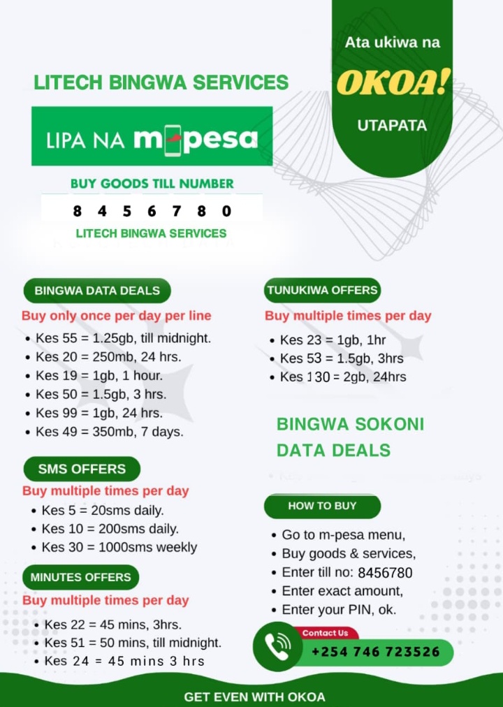 Bingwa Sokoni, through service partners such as Litech Bingwa Services, has introduced an innovative approach that allows users to access affordable, flexible, and instant data bundles even when their Okoa Jahazi limits are exhausted. Customers can now purchase data, SMS, and call minutes directly through Lipa na M-Pesa till numbers, eliminating the restrictions tied to debt balances on their Safaricom accounts.